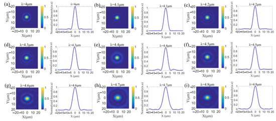 Simulated normalized intensity profiles in the xy-plane (left panels of (a–i)) at the fixed position of z = 200 μm, i.e., the designed focal plane, at wavelengths from 4.0 μm to 4.8 μm (spaced by 0.1 μm) (a–i), showing strong focal spots with weak sidelobes. Simulated normalized light intensity along the x-axis (right panels of (a–i)) at the focal plane, i.e., the horizontal cuts of the focal spots.