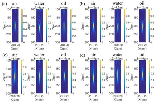 Focusing performance of the designed metalens at wavelengths of 4.0 μm (a), 4.2 μm (b), 4.4 μm (c) and 4.6 μm (d), when the metalens is under the environment of water or oil.