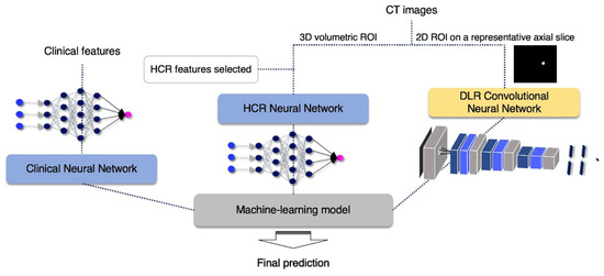 Several limitations of our study need to be addressed. First, we did not account for the possibility of overlapping among heterogeneous features. While we removed features with a high correlation within the HCR features, the correlation between each network input feature was not analyzed. This is likely to impede the final model performance and involves a process that is less efficient. Second, the DLR convolutional neural network model used a representative 2D slice rather than a full 3D volumetric image, indicating a possible loss of information. However, the effective through-plane (z)-resolution is typically much lower than the in-plane resolution of the axial slice, thus, the use of 2D slices may still produce better results [41]. Several studies have attempted to improve the z-axis resolution [54,55,56]; therefore, as research in this field develops, the algorithm can be improved upon by incorporating a 3D CT image. Thus, in future studies, we plan to develop a more robust model that utilizes a complete 3D CT image, as well as eliminating redundancy between heterogeneous data. Furthermore, we plan to develop a model that utilizes all three different neural networks simultaneously.