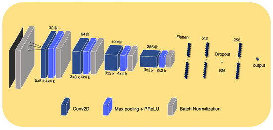 The DLR convolutional neural network model input was a 2D ROI image on a representative axial slice, where tumor pixels were the largest within the entire volume of the CT image of each patient. Using this network, a large diversity of features was learned, especially through non-linearity operations, as images were passing through convolutional blocks. The DLR convolutional neural network contained four convolution layers and two fully connected layers. The Max-pooling layer, parametric PReLU as an activation function, and batch normalization layer followed after convolution layers, and 0.5 of dropout probability was included between the fully connected layers to avoid overfitting. A detailed composition is shown in Figure 3. The training was optimized with stochastic gradient descent and began with an initial learning rate of 0.01 and a momentum of 0.5. This learning rate fell 0.8×, to at most 0.0005 when the validation loss stopped diminution for a time. The model provided automatically augmented images from the original input images. These images were generated in simple ways including rotating (~20°), flipping (vertically or horizontally), or shifting.