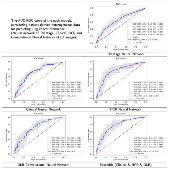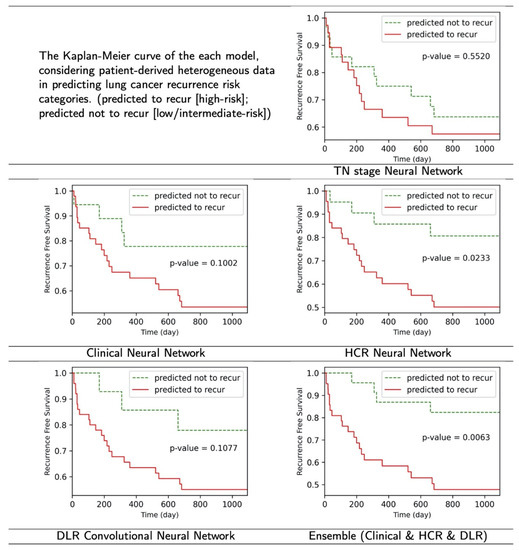 Considering that the TN staging has limitations such as patient to patient recurrence rate variations [29], this study attempted to develop and validate an NSCLC recurrence prediction model for patients with surgically resected lungs. Using the same data sets, the three proposed neural network-based models (Clinical neural network, HCR neural network, and DLR convolutional neural network) were more accurate in predicting recurrence than existing representative models [38,40,41].
