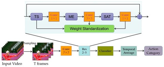 Our network architecture consists of four main components, a temporal shift (TS) module, a spatial and temporal (SAT) module, a motion encoder (ME) and WS method used in each convolution layer, since both spatial and temporal information as well as appearance features are crucial for action recognition. ResNet-50 is chosen as the backbone for two reasons: on one hand, the representation of spatial–temporal information could be enhanced by the TS + ME + SAT structure. On the other hand, the original frame-wise appearance features are also preserved by the residual structure. The 2nd to the 5th layers of the ResNet-50 are all constructed the same way as shown on the right-hand side of Figure 2. First of all, the input features are processed by the TS module (followed by a 1 × 1 Conv layer) to complete the partial information exchange across frames. Then the motion features are captured by the ME module. Next, a SAT module is attached to extract spatial–temporal information. Finally, the WS method is embedded in each convolution layer to expedite training and convergence.