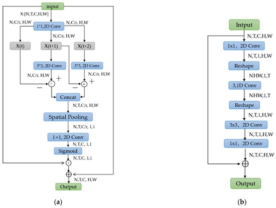 Figure 4b shows the detailed structure of SAT. Suppose that the input feature is written as a vector , where denotes the batch size, denotes the temporal dimension, represents the number of channels, and and are the resolution of the input. The channel numbers of the input tensor are squeezed by a scale ratio . equals the channel number of the input tensor . This could be written as