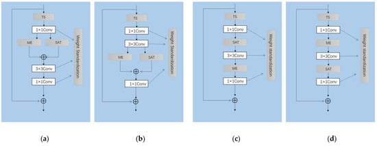 - Thirdly, the SAT module is placed in each bottleneck layer (after the 1st Conv1 × 1) and appends the ME module after the 3 × 3 Conv layer of all bottleneck layer (shown in Figure 7c);