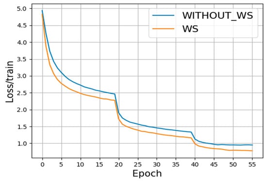 We propose the WS method (working together with BN) to accelerate the training process and expedite convergence. In this section, we use Something-Something-V1 as the dataset by sampling eight frames as the network input and compare the loss values over iteration during training between the network with WS and without WS so as to demonstrate the function of WS method. The results are shown in Figure 8 below. The blue curve characterizes loss values without WS, while the orange curve indicates the values with WS. Obviously, the orange curve decreases faster than the blue curve, and its value at the 55th epoch is lower than that of the blue curve. Since the loss value directly demonstrates the speed of training, we thereby conclude that WS indeed facilitates training and convergence.