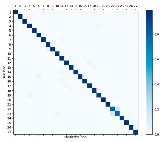 Each column of the confusion matrix represents the predicted label of the video, and each row represents the real label of the video. Since Jester has 27 categories, we represent these 27 categories using numbers 1~27. For example, the number 21 stands for “thumbs up” and the number 22 stands for “thumbs down”. The value on the diagonal of the matrix represents the proportion of video samples that is correctly classified. Therefore, the more that predicted categories fall on the diagonal, the better the recognition performance. Apparently, almost all categories on Jester are correctly classified, which indicates the strong discrimination ability of MEST.