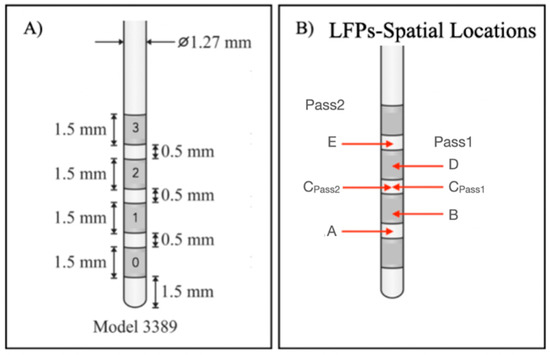 (A) Medtronic 3389 lead DBS model: each contact has a length of 1.5 mm, and the distance between two adjacent contacts is 0.5 mm; (B) LFP spatial locations of bipolar signals. Each spatial location corresponds to the midpoint between the considered channels.