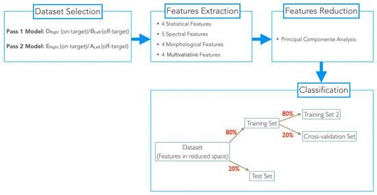 While a high number of features may help to discriminate classes, there is a greater potential for overfitting, especially in small datasets. Moreover, irrelevant features can also blur the boundaries between classes [54]. For dimensionality reduction, principal component analysis (PCA) was used, a feature projection method that uses orthogonal transformations for transforming a set of observations of possibly correlated variables into a set of linearly uncorrelated variables (principal components) [7]. The PCA was performed using the pca MATLAB function. The minimum number of principal components (PC) in each Pass-based methodology was chosen as the minimum number that kept 99% of the variance of the entire dataset [55]. The dataset transformed in the reduced space was then used for classification.