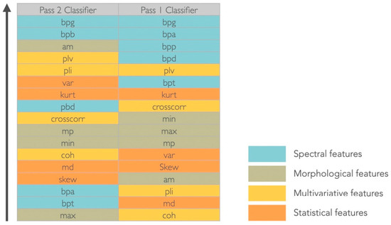Ranking features results. Abbreviations—Spectral features: bpd (band power delta), bpt (band power theta), bpa (band power alpha), bpb (band power beta), bpg (band power gamma); Morphological features: am (absolute mean), mp (mean peaks), max (maximum), min (minimum); Multivariate features: crosscorr (cross-correlation), coh (coherence), plv (phase locking value), pli (phase lag index); Statistical features: var (variance), kurt (kurtosis), md (median), skew (skewness).