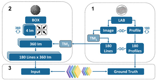Overall methodology chart. (1) Laboratory laser profiles. (2) Images inside box. (3) CNN.