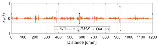 In this work, the Mexican Hat wavelet was chosen as suggested by [25]. The choice of the wavelet determines a threshold value which is a function of the wavelet itself and the RMS value of the upper part of the signal. All points for which the wavelet transform value is over the threshold as well as their two adjacent points are removed and replaced by a linear interpolation between the closest valid readings. Figure 4 shows the identified peaks in the upper part of the signal while Figure 5 displays the corresponding wavelet transformation, the threshold value and the identified outliers.