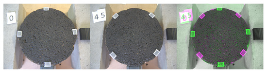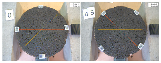 Each sample had a diameter of approximately 145 mm due to the width of the core extractor and covered an area of 165 cm2. The samples were cleaned with water and a thin brush and left to dry naturally for two days. Four markers containing a checker pattern were added to each sample in order to use them as control points to fit a projective transformation matrix. Each pattern contains 10 × 7 alternated white and black squares, where each square side measures 1 mm; this yields a total of 54 control points per marker.