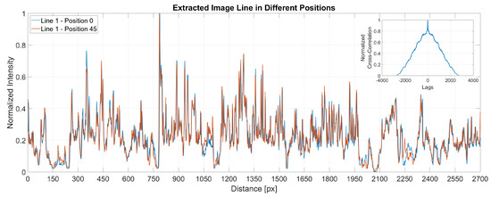 Figure 7 present a plot of the same line extracted from two different images at two different positions. The x-axis shows the distance in pixels while the y-axis stands for the normalised intensities. At the top right corner, the figure displays the cross-correlation for the two extracted signals, showing that the maximum correlation between the signals is when the lag is zero. The small differences noticed between the signals are due to the change of the light conditions between sample positions.