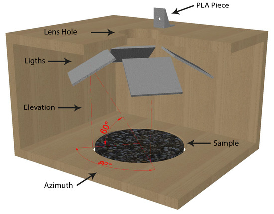 In this study a special lighting box was constructed with the scope to isolate the samples from environmental lighting and therefore to have only the contribution from direct light sources. The building process followed the Fast Development Cycle suggested by [26]. The structure of the box was made entirely of wood. The dimensions of the box were carefully designed in order to achieve the desired optical scale for the camera. In the top face, a hole with the dimension of the lens diameter was drilled with the purpose to host it. Even though the hole was drilled accurately, a millimetric space between them still exists; therefore, to fully block the incoming light a high-density polyurethane foam was placed around the lens and the hole. All the interior walls, ceiling and floor of the box were covered with light absorbing fabric in order to avoid unwanted reflections from the walls.