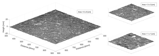 Finally, Figure 18 shows three zoom-in portions of the smoothed three-dimensional reconstruction of the dense graded surface. The axis is only expressed for the bigger portion in the left part of the image. The x- and y-axis are in 10th of mm while the z-axis is represented in mm.