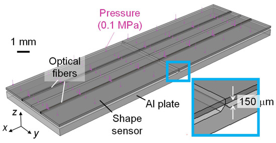 To evaluate the validity of the proposed shape sensor, a finite element analysis was performed using Abaqus 2021 (Dassault Systemes, Vélizy-Villacoublay, France). Figure 5 shows an overview of the finite element model. The analysis was performed by pressing the shape sensor onto a triangular prismatic protrusion at one atmospheric pressure. The height of the protrusion was 150 μm, which corresponded to the thickness of one ply of the prepreg and was the maximum deformation expected in the demonstration test described below. The shape sensor was modeled based on the cross-sectional observations (Figure 4), and frictionless contact was defined between the sensor and the aluminum plate. Table 1 summarizes the material properties used.