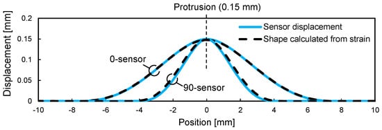 The distance from the neutral axis of the sensor to the optical fiber core was determined to be 25 and 65 μm for the 0-sensor and 90-sensor, respectively, based on the strain distribution in the thickness direction of the shape sensor. Figure 6 shows the sensor shapes calculated using Equations (1) and (3) based on the strain distribution in the optical fiber cores. The sensor displacement obtained from the finite element analysis is also shown for comparison, indicating that the sensor shape could be calculated accurately using the proposed method. To follow the deformation at the height of 150 μm, the 0-sensor and 90-sensor required 6 mm per side and 4 mm per side, respectively. The bending rigidity of the shape sensor is proportional to the elastic modulus of the sheet material (Table 1), and the 0-sensor has a bending rigidity that is more than 10 times that of the 90-sensor. From the analysis results, the 90-sensor with lower rigidity is expected to be more sensitive to prepreg deformation during consolidation.
