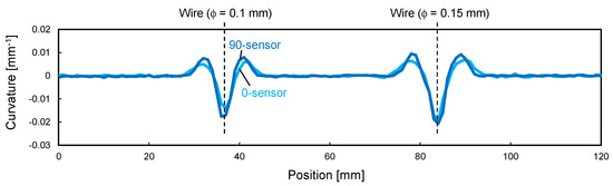 Figure 8 shows the curvature distribution measured by the two sensors. The M-shaped curvature distribution caused by the convex deformation was successfully measured, and the curvature magnitude was greater in the higher convex part (i.e., 150 μm wire). The repeatability of strain measurement by ODiSI A-50 was ±2 με, and from Equation (1), the measurement error of curvature was calculated to be ±8 × 10−5 mm−1 for the 0-sensor and ±3 × 10−5 mm−1 for the 90-sensor, respectively. The micrometer-scale deformation caused sufficiently large curvature changes compared to the measurement error, confirming that the proposed sensor can sensitively detect micrometer-scale deformations. It is interesting to note that the 0-sensor had a slightly wider and smaller curvature than the 90-sensor, especially at the 100 μm wire position. This was because the bending rigidity of the 0-sensor was very high, which prevented the sensor from completely following the steep deformation of the composite sheet. Figure 9 shows the sensor shape calculated from this curvature distribution using Equation (3). The convex shapes with heights of 100 and 150 μm were obtained with good accuracy, confirming that the fabricated shape sensor can be used to quantitatively evaluate micrometer-scale deformation. In the heating test using an oven, the curvature of the sensor did not change as the temperature increased. As an example, Figure 10 shows the curvature distribution of the 0-sensor at the 100 µm wire position. Thus, it was confirmed that stable shape evaluation is achievable, even during composite curing under heating conditions. In the next section, this sensor system is applied to the consolidation monitoring of a composite gap/lap region.