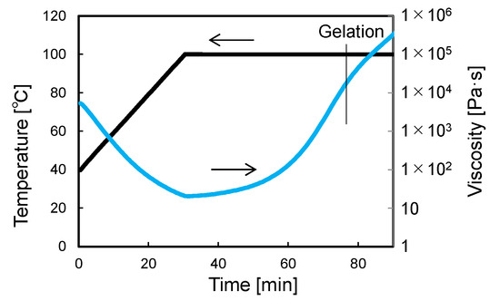 Additionally, as a preliminary preparation, the viscosity of the epoxy resin during the curing process was evaluated using a rheometer (MCR102, Anton Parr, Graz, Austria). The resin was squeezed out of the T700S/2592 prepreg. Figure 12 shows the measured changes in viscosity. The viscosity decreased with increasing temperature but increased after reaching the holding temperature of 100 °C. At 100 °C, the viscosity increased slightly at first and then increased rapidly after 30 min. Based on the time at which the storage modulus of the curing resin exceeded the loss modulus, the resin solidification (i.e., gelation) was identified as occurring 45 min after 100 °C was reached.