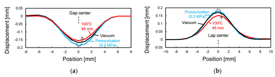 Cross-sectional micrographs of the specimen after curing. Note that the photos were compressed horizontally by a factor of five to make deformations more clearly visible. (a) Gap. (b) Lap.