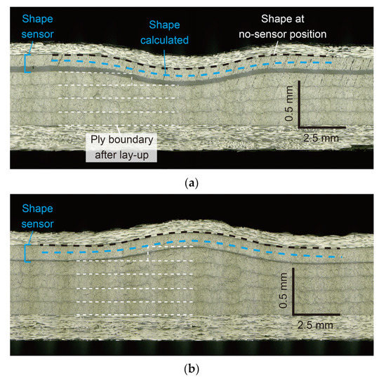 Figure 11 shows a schematic of the specimen. The carbon/epoxy prepreg (T700S/2592, Toray, ply thickness 150 μm) was used as the material, and the stacking sequence was [02/902]S. The prepreg sheets were laid up by hand, with a 5 mm wide gap and lap on one ply of the 90° layer just below the upper 0° layer. Two 6 mm wide sections of one ply of 0° prepreg directly above the gap/lap were removed, and the two kinds of 6 mm wide shape sensors were inserted there. The entire specimen was vacuum bagged and then cured in an autoclave via heating. The curing process was as follows. Following vacuuming, the autoclave was pressurized to 0.3 MPa at 20 °C, then heated to 100 °C at 2 °C/min, maintained at 100 °C for 90 min, and then cooled to room temperature at 2 °C/min. The curvature of the shape sensor during this curing process was measured by the measurement system (ODiSI A-50). The measurements were taken manually when predetermined temperatures were reached, and each measurement took less than 5 s to complete. After curing, the thickness distribution of the specimen was measured using a 3D scanner (ATOS Core Essential Line 5M, GOM Metrology, Braunschweig, Germany), and the cross section of the specimen was polished for observation.