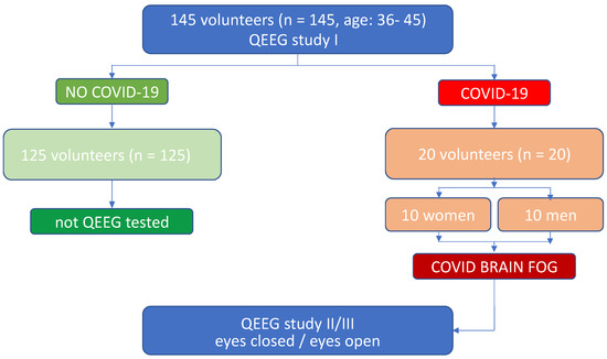 In 2019, before the epidemic broke out, a QEEG workup was carried out among 145 employees of the University of Rzeszow, who decided to participate in the QEEG baseline screening test to learn about the QEEG method and to assess the activity of their own brain. Several months later, 20 people in this group were identified as having developed problems with memory, spatial orientation and concentration after contracting COVID-19. These people reported problems with remembering the content of the lecture materials. Therefore, after visiting a neurological clinic and performing a number of laboratory tests, as well as after obtaining a negative test for the persistence of coronavirus infection, the doctor proposed to perform a complementary QEEG diagnostic test. Due to technical and logistical availability to use QEEG according to the protocol used previously in a baseline screening, the option to perform the second QEEG test, being parallelly the follow-up of their electrophysiologic record appeared and the study participants after obtaining the full informed consent took advantage of it (Figure 1).