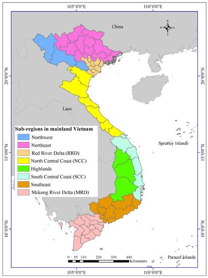 Eight sub-regions for developing rice yield prediction in mainland Vietnam: Northwest, Northeast, RRD, NCC, SCC, Highlands, Southeast, and MRD [33].