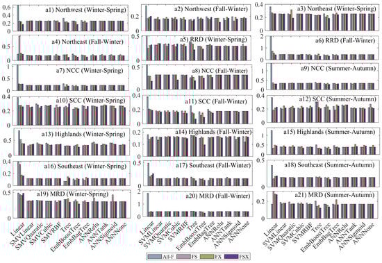 Based on models derived from ML methods, the best model for a particular feature set (All-F, FS, FX, and FSX) is determined and presented in Figure 5(a1–a3). From left to right, the columns show the RMSE of the best model generated from All-F, FS, FX, and FSX sets, respectively. The results show that the FS, FX, and FSX sets outperform or are at least at the same level as the All-F set except for Winter–Spring in SCC and Highland (Figure 5(a1)) and Fall–Winter in NCC (Figure 5(a2)), where the RMSE of the FS- and FX-based models are larger than that of the All-F-based models. The percentage of the best FS-, FX-, and FSX-based models better than the best All-F-based models are 71%, 71%, and 90%, respectively, while 85% (90%) of the best FSX-based models are better than the best FS-based (FX-based) models. In addition, 81% of the best FS-based models are better than the best FX-based models. Those percentage values are generated from the data in Figure 5(a1–a3). Moreover, the used ML methods denoted by the number in the columns in Figure 5(a1–a3) reveal that feature subsets primarily work well with Tree (4/4/8/4 models for All-F/FS/FX/FSX), EmbBoostTree (8/10/7/14 models for All-F/FS/FX/FSX), and EmbBagTree (1/2/4 models for All-F/FS/FX).
