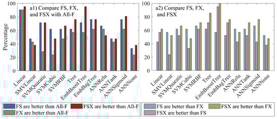Percentage of FS-, FX-, and FSX-based models outperforming All-F-based models (a1); FS-based models being better than FX-based models, FSX-based models being better than FS-based models, and FSX-based models being better than FX-based models (a2).