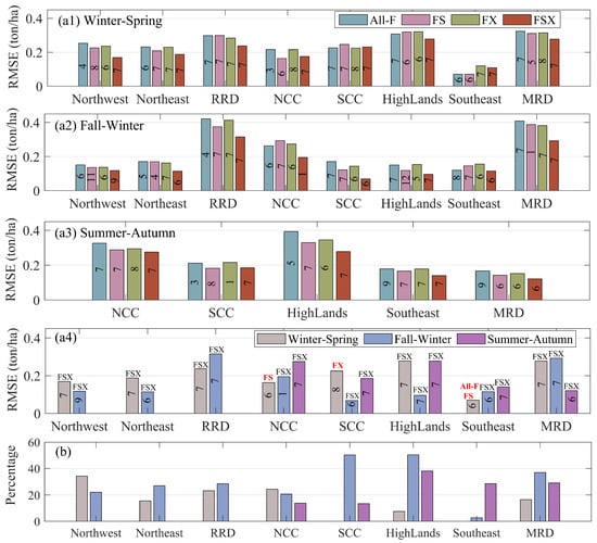 Figure 5b indicates the improvement of the final models compared with the All-F models. The advantage ranges from 0% to 60%, fluctuating from sub-region to sub-region and from season to season. The average RMSE of these final models is smaller than that of All-F models at an average level of 0.054 tons/hectare (21%) (these data are not exhibited in Figure 5b).