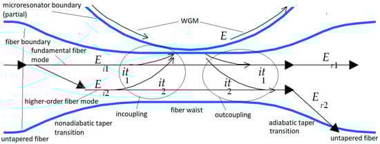 The results presented in the next section are based on the following method of analysis of the system described in the last paragraph of the Introduction. First, consider the system in more detail. Typically, a WGM of a microresonator is excited by coupling in tunable laser light from a single fiber mode, using an adiabatically tapered fiber. The enhancement scheme uses a non-adiabatic tapered fiber to couple light from two fiber modes into the microresonator, as illustrated in Figure 1. The WGM will belong to one of two polarization families, TE (transverse electric) or TM (transverse magnetic). The input light in the fiber will be linearly polarized to match the WGM polarization.