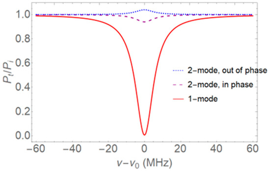 The very large value of the enhancement factor η21 is therefore due, in part, to the fact that the coupling is near critical in the one-mode case, where the dip-depth sensitivity is expected to be low [5]. However, the two-mode dip-depth sensitivity is even greater than that of the one-mode case far from critical coupling, as seen by the following. Since Q = ν/Δν, Equation (9) shows that the first factor on the right-hand side of Equation (18) is proportional to Q. Now evaluate the right-hand side of Equation (12) with T2 = 0, as in the ideal one-mode case, and note that it is proportional to the intrinsic quality factor Qi, which is inversely proportional to αL. Equating the left-hand sides of these two equations (the dip-depth sensitivity) results in the following relation (x = T1/αL, and can range from <<1 to >>1):
