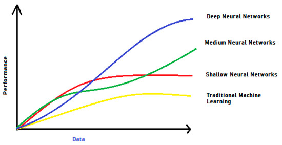 Deep Neural Networks have captured a major area of research in the domain of machine learning in the past decade [21,22,23,24]. The result of this effort has proved extraordinary results across a wide series of application fields. Taking DL as a subtype of machine learning (ML) that learns to represent data as a layered hierarchy of concepts within neural network layers to attain high performance and flexibility. As the size of the data rises, deep learning beats regular machine learning, as seen in Figure 1. Anomaly detection algorithms based on DL have grown in reputation in recent years and are applied to various applications; studies have shown that deep learning totally outperforms previous approaches [25,26].