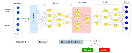 A VAE has been shown to be successful in outlier detection as well as providing a wide range of complicated data. This assumes that normal samples’ latent representation is compatible with a Gaussian distribution. It means that all training datasets are grouped in feature space, and anomalies are located distant from the cluster [47]. Through a latent space, VAE can acquire the feature distribution for high-dimensional input data.