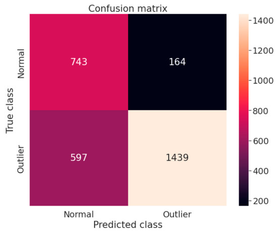 Figure 6 shows the confusion matrix of the outlier and normal sample from the Statlog (Landsat Satellite) dataset. According to the graph, 743 samples were correctly classified as normal samples, 164 normal were misclassified as abnormal samples, and 597 outlier samples were incorrectly classified as normal samples. The Satellite dataset contains 1439 outliers that are correctly classified as anomalies.