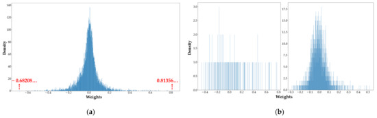 It can be seen from Figure 1 that the macroscopic distribution of single-layer weights in CNNs generally obeys bell-shaped and long-tailed distributions [49]. However, in fact, there is no established rule for the specific weight distributions. In some layers, the distribution of positive and negative weight values in the long-tailed part has large variability, and the maximum absolute positive and negative weight values are not in the same range, as shown in Figure 1ab; therefore, the selection of the quantized value range in INQ is not universal. Meanwhile, the quantized value range boundaries in INQ are determined by the formula , where and indicate the two bounds of the quantization value range in INQ, and indicates the bit-width to which we want to quantize the weights. This approach does not fully utilize the expressiveness of the quantization bit-width binary numbers, and the quantization value range is set to a small extent. This suggests that INQ does not achieve the best quantization accuracy for this quantization bit-width. To address these issues, a sign-based weight-quantization strategy is proposed in this paper.