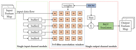 According to the PE in the previous section, we designed a shift-based convolutional computation module with a 5 × 5 convolutional kernel as an example, as shown in Figure 7.