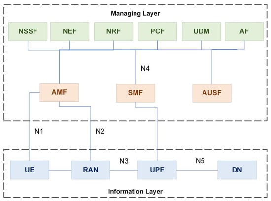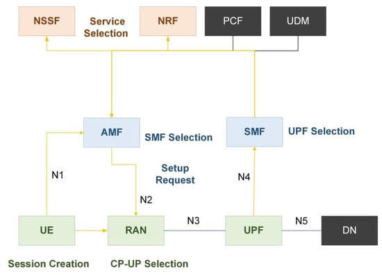 - Dynamic service positioningThe 5G SBA is anticipated to comprise modular, dynamically connected NFs and services. Every service may offer a diverse set of features depending on the demands and service type. The self-contained smaller and more modular NFs joined and freely linked to instantiate an E2E network slice [55].