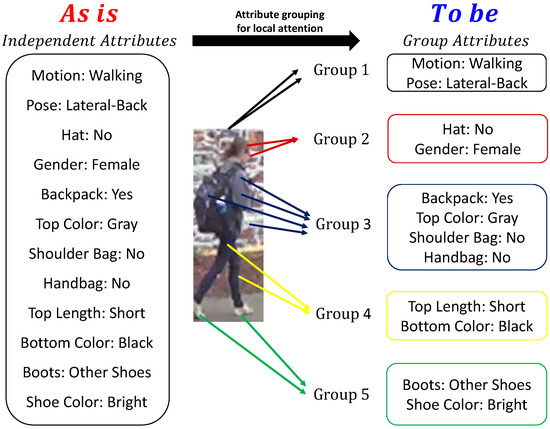 Attribute grouping for local attention. Physically-adjacent pedestrian attributes are grouped into one group. Group 1 is for attributes related to the entirety of a pedestrian. Groups 2, 3, 4, and 5 are for attributes related to the head, upper body, lower body, and feet of a pedestrian, respectively. The network focuses on the semantic information of the pedestrian such that it helps in recognizing pedestrian attributes occluded by obstacles.