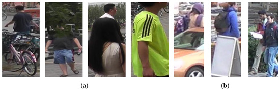 (a,b) represent the occlusion types in MARS and DukeMTMC-VideoReID datasets, respectively. Various occlusion types exist, such as a lower body or head of a pedestrian occluded by other pedestrians, tracking failure, and so forth.