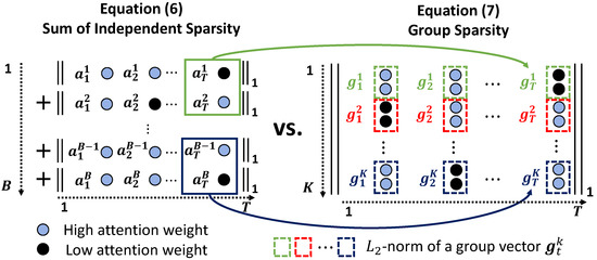 where always has positive values; hence, the sum of these values has the same effect as the norm [21,22,23]. is a balancing hyperparameter for the k-th group in the sum of all the group-sparsity loss functions. It is set as a reciprocal of the number of attributes in each group, because each group has a different number of attributes.