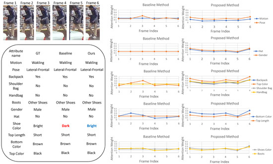 We visualized the temporal attention weight vector with various segment frames to analyze the improvement of the proposed method in occlusion situations. Figure 6 presents the temporal attention vectors and PAR results of the method presented by Chen et al. [13] and that of our method for all the groups in the DukeMTMC-VideoReID dataset. The values of the baseline method are similar in all the frames. Thereby, the baseline method failed to recognize the “shoe color” attribute. In contrast, the values of the proposed method are different in each frame. Moreover, the values of the occlusion frames are lower than those of the general frames. The attention weights of the bottom- and top-length attributes are simultaneously controlled, because they belong to the same group. For the same reason, the attention weights of the “shoe color” and “boot” attributes are also simultaneously adjusted. Consequently, the proposed method accurately predicted all attributes. It shows that the proposed group-sparsity constraint helps STAM accurately focus on non-occlusion frames.