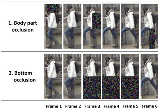 We designed two synthetic occlusion scenarios, as illustrated in Figure 7, to validate the improvement of the proposed method on several occlusion samples. These two occlusion scenarios are designed to analyze the impact on recognition performance if a part of the appearance of pedestrian frames is distorted by blurring, low illumination, or an object such as another pedestrian or car.