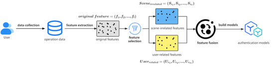 In this section, we will describe the proposed SIURUA in detail. In order to reduce the impact of different scenes on the hybrid scene features, we propose the selection of scene-irrelated features and user-related features and then propose fusing them to improve the authentication accuracy of the model in hybrid scenes. Figure 1 shows the block diagram of SIURUA. The steps include feature extraction, feature processing, and model training. In Figure 1, we can see the basic process of SIURUA in more detail: