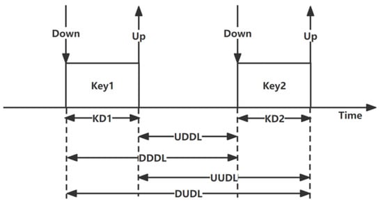 We obtain the key pairs according to the time keys are pressed. After the key pairs are obtained, the keystroke features can be extracted [40]. According to the pressing time (down) and the release time (up) of each key, the single key features, and key pair features, as shown in Figure 2, can be obtained (in milliseconds) [41]: