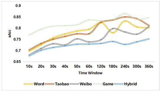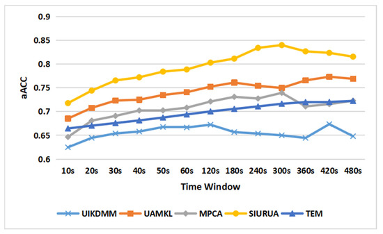 Due to the particularity of a hybrid scene user keystroke dynamics and mouse dynamics dataset, we reproduced the above algorithms and experimented on multiple time window values. Figure 13 shows the authentication accuracy of SIURUA and the above four algorithms. It can be seen that the accuracy of SIURUA with all-time window values is better than that of some of the existing methods. The maximum aAcc of SIURUA is 84.0% at 300 s. UIKDMM and UAMKL achieve the maximum aAcc, 67.4%, and 77.3%, respectively, at 420 s. MPCA achieves the maximum aAcc 73.9% at 300 s. TEM achieves the maximum aAcc 72.2% at 480 s. Therefore, it is necessary to reduce the impacts of scene information in hybrid scenes, and SIURUA is superior to some of the existing algorithms.