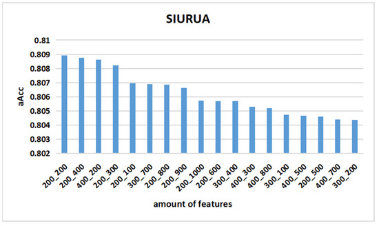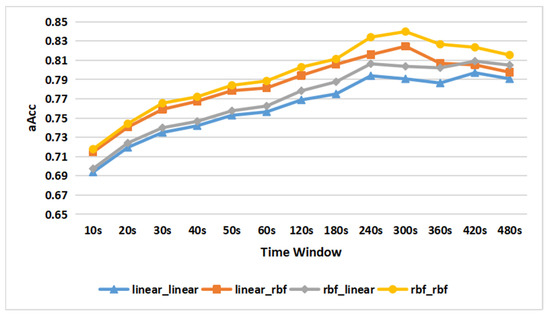 This experiment selects the optimal kernel combination from the above four kernel combinations. The aAccs of the four kernel combinations with each value of the time window are shown in Figure 9, the number of feature combinations is 200 plus 200, and the time window = 300 s. It can be seen that in the case of RBF plus RBF and Linear plus RBF, the highest aAccs are 84% and 82.5% obtained in 300 s. In the case of Linear plus Linear and RBF plus Linear, the highest aAccs are 79.7% and 80.9% obtained in 420 s. We can see that RBF plus RBF gains the maximum aAcc in the smallest value of the time window. Therefore, the appropriate kernel combination for SIURUA is RBF plus RBF when the time window = 300 s and the number of feature combinations is 200 plus 200.