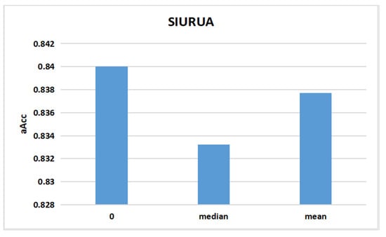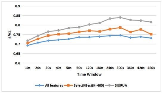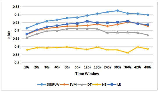This section will summarize the various algorithms mentioned in Section 4.2.2, Section 4.2.3, Section 4.2.4, Section 4.2.5, Section 4.2.6 and Section 4.2.7. According to Section 4.2.2, Section 4.2.3, Section 4.2.4, Section 4.2.5, Section 4.2.6 and Section 4.2.7, when the time window = 300 s, the feature selection number is 200 plus 200, and the kernel combination is RBF plus RBF, SIURUA achieves the best accuracy, which is 84.0%. As shown in Table 6, it can be seen that SIURUA has obtained the highest aAcc, aPrec, aTPR, and aF1, as well as the lowest aFPR (aFAR) and aFRR of all the methods. Table 6 shows that SIURUA, as proposed in this paper, has excellent performance. It can obtain 0.840 aAcc, 0.841 aPrec, 0.85 aTPR, 0.169 aFPR (aFAR), 0.15 aFRR, and 0.839 aF1 with the conditions of time window = 300 s, 200 plus 200 features, and an RBF plus RBF kernel combination.