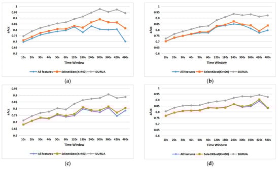 (a) Comparison of accuracy between SIURUA and the selection of 400 best features in a typing scene; (b) comparison of accuracy between SIURUA and the selection of 400 best features in a Taobao scene; (c) comparison of accuracy between SIURUA and the selection of 400 best features in a Weibo scene; (d) comparison of accuracy between SIURUA and the selection of 400 best features in a gaming scene.
