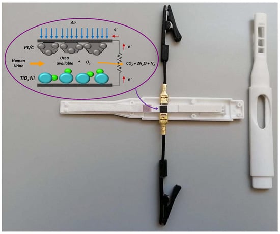 - Dector, D.; Ortega-Díaz, D.; Olivares-Ramírez, J.; Dector, A.; Pérez-Bueno, J.; Fernández, D.; Amaya-Cruz, D.; Reyes-Rojas, A. Harvesting energy from real human urine in a photo-microfluidic fuel cell using TiO2–Ni anode electrode. Int. J. Hydrogen Energy 2021, 46, 26163–26173. [Google Scholar] [CrossRef]